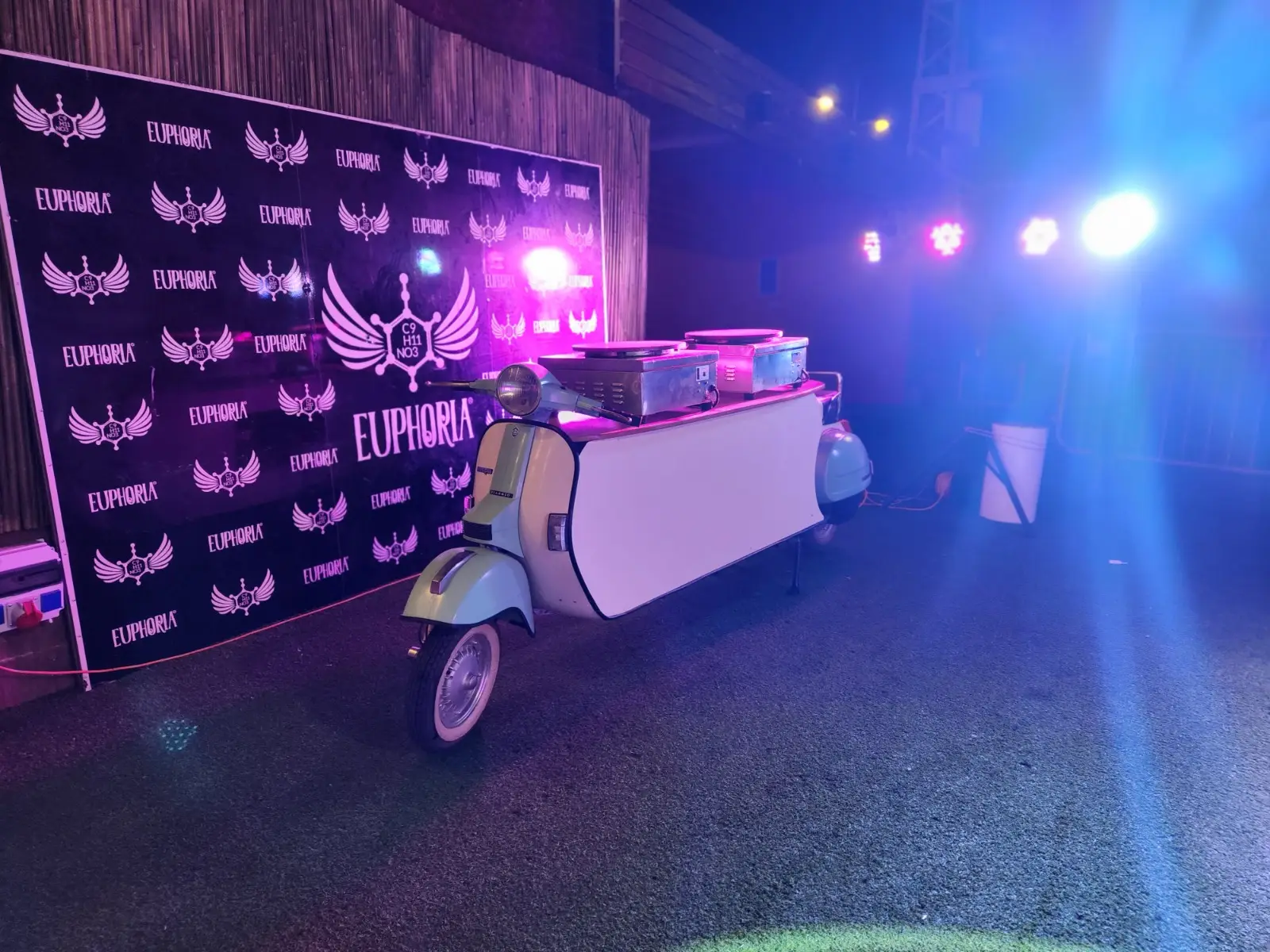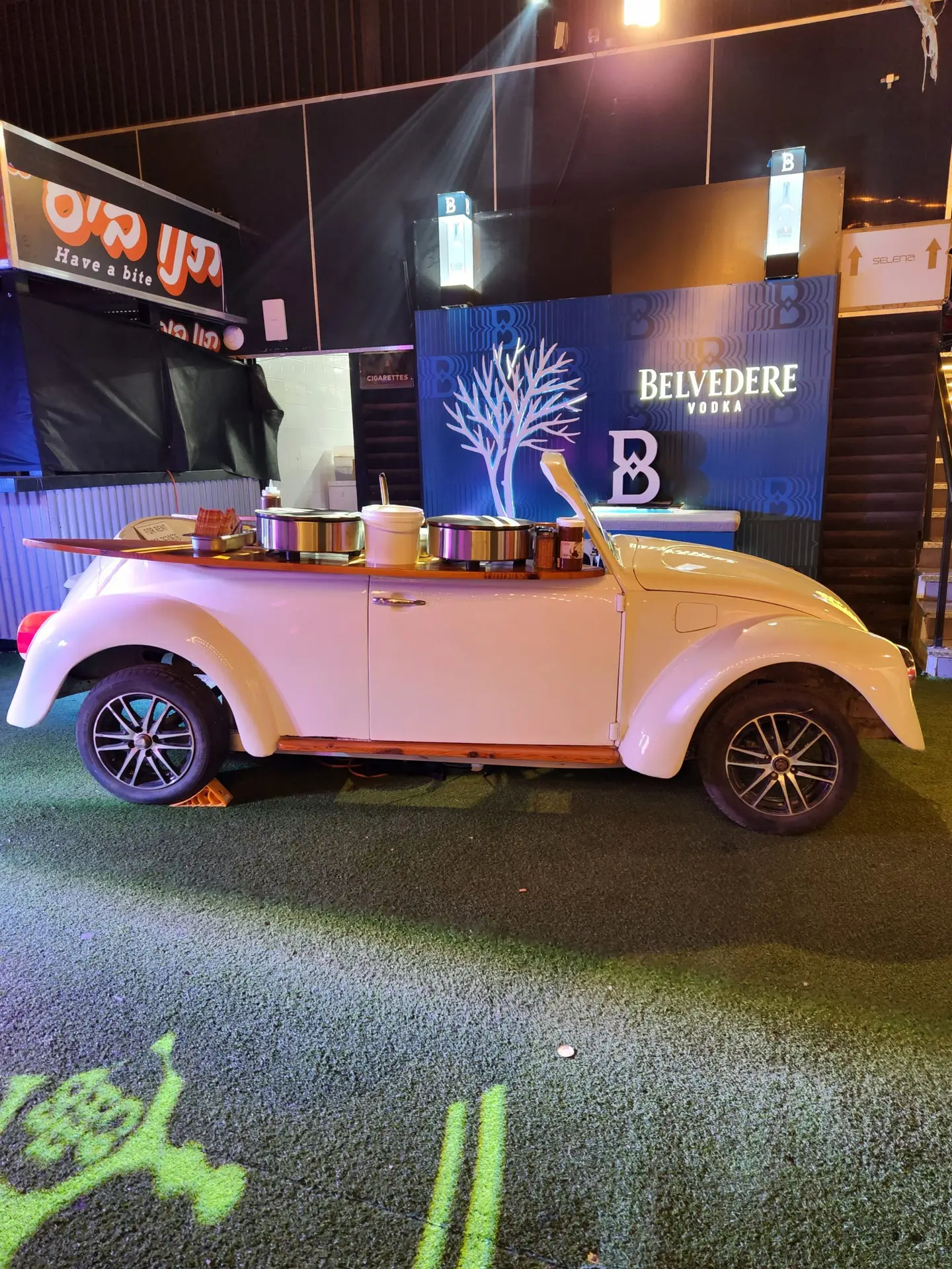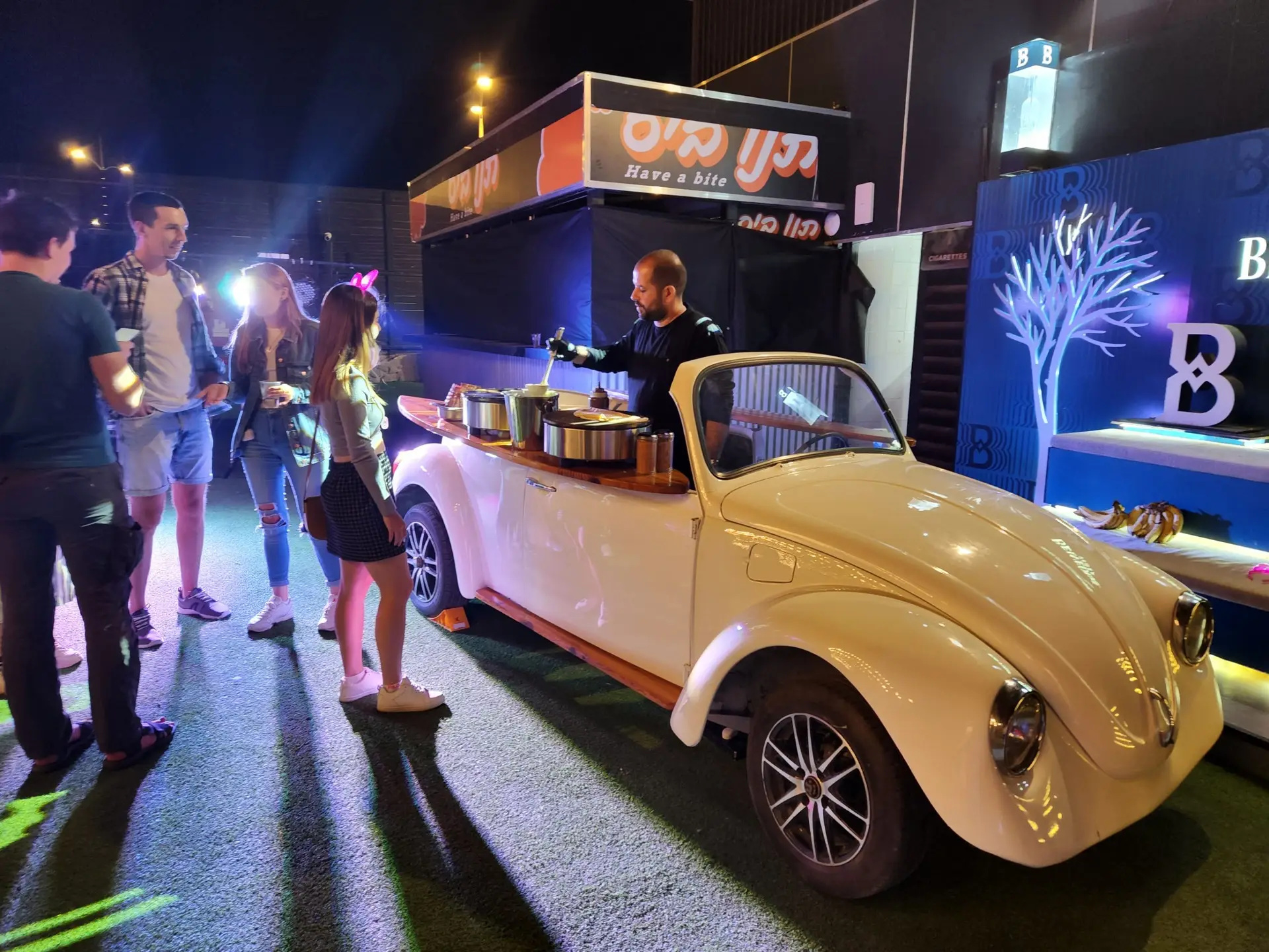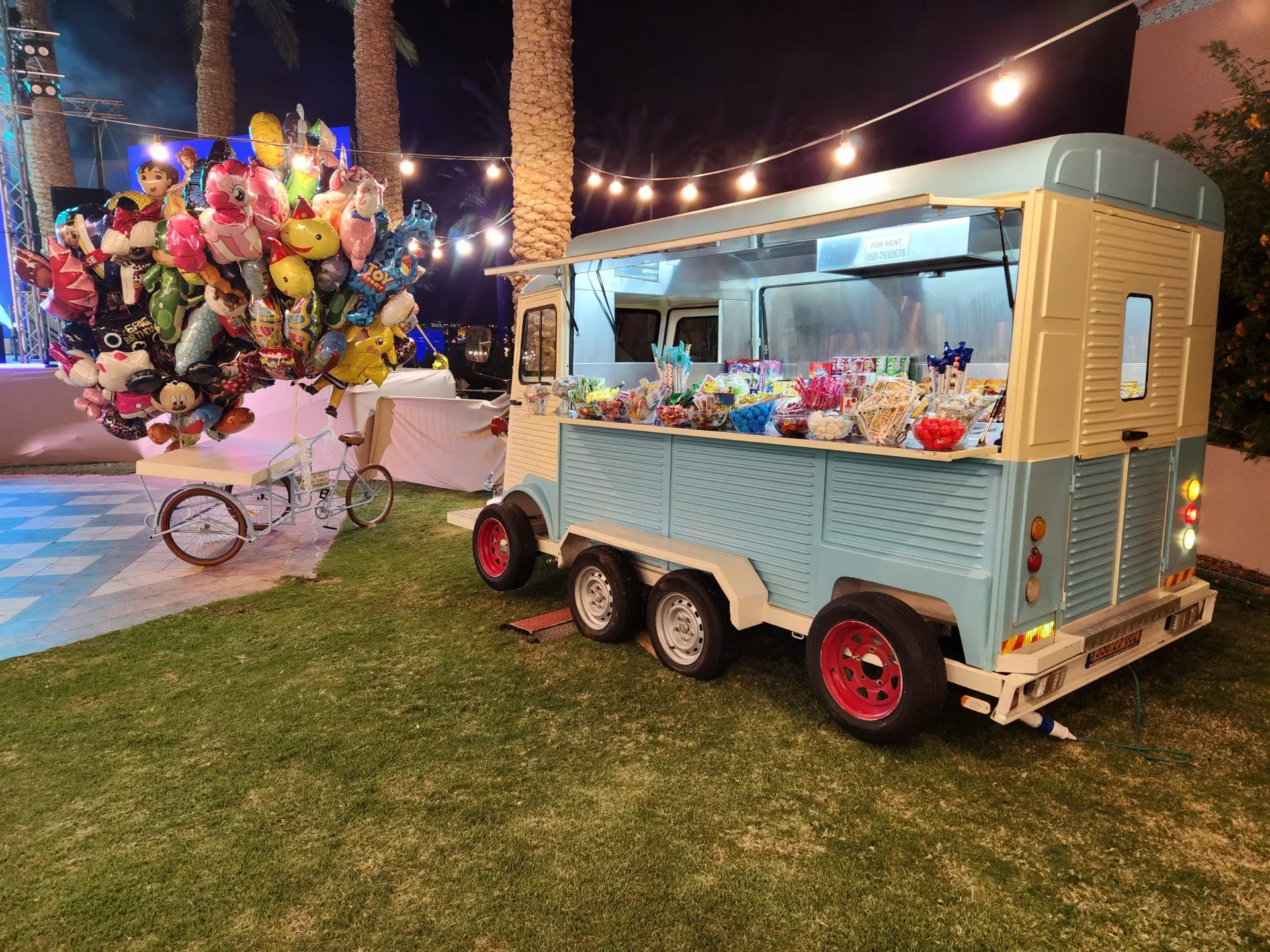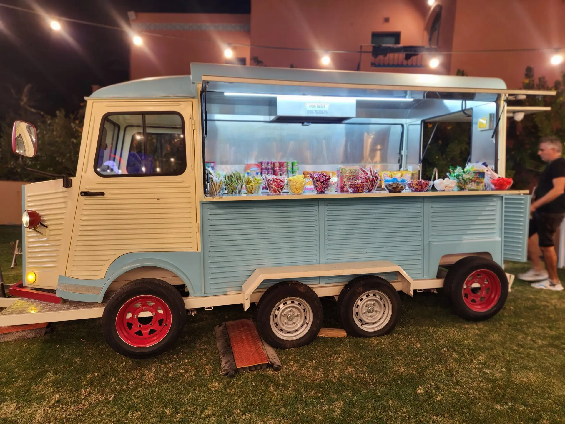 וניתן לשלב מבחר הפריטים – גזוז של פעם, ממתקים, קרפ צרפתי, קרפ בלגי, קרח בטעמים, גלידה, תירס חם, נקניקיות, שווארמה ועוד…